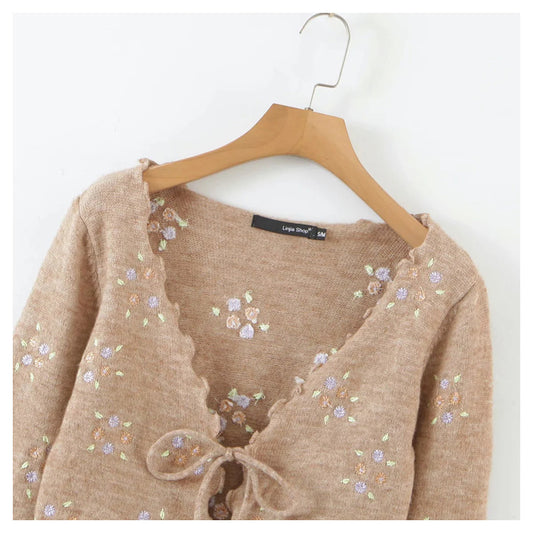 Schmales Strick-Cardigan-Oberteil 7258 mit französischem Retro-Pilzrand und gestickten Blümchen zum Schnüren