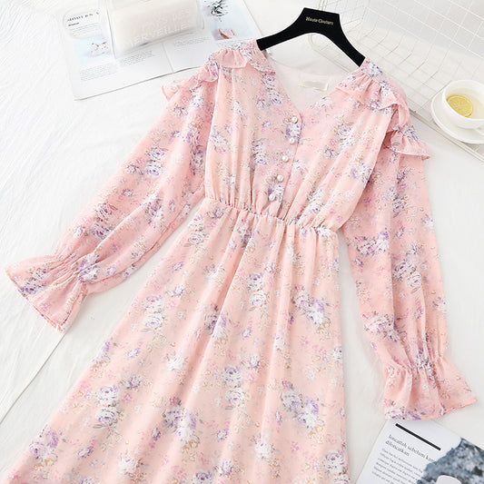 Französisches Retro-Blumen-Taillenverschluss-reizvolles Rüschen-Chiffon-Kleid 7056