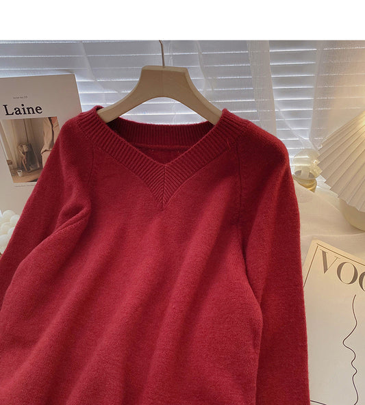 Fauler Strickpullover einfarbig V-Ausschnitt Pullover Top 6677
