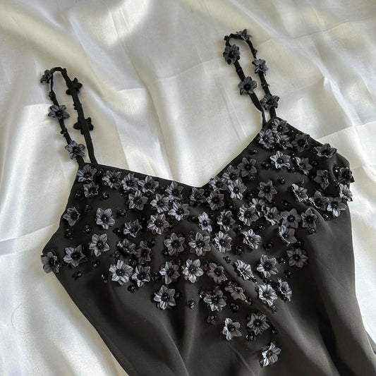 🖤✨ Schönes, elegantes, exquisites Vintage-Kleid aus schwarzem, floralem Perlenbesatz mit 3D-Blumenapplikation, asymmetrischem Rüschenkleid, Midi-Chiffon, Heimkehrkleid, Ballkleid, Abendkleid, Partykleid, Abschlusskleid, gh3940