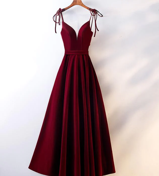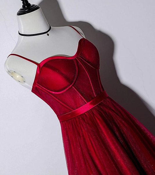 Schönes dunkelrotes Kleid mit Trägern in Teelänge für Hochzeiten, Heimkehrkleid gh296