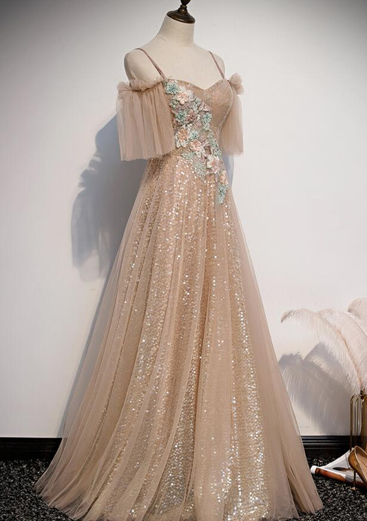Bezauberndes langes Partykleid aus champagnerfarbenem Tüll und Pailletten, A-Linien-Abschlussballkleid gh319
