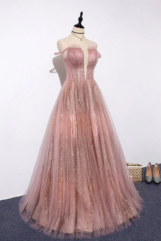 Einzigartige rosa Pailletten Tüll schulterfrei langes Abschlussballkleid in benutzerdefinierter Größe gh329