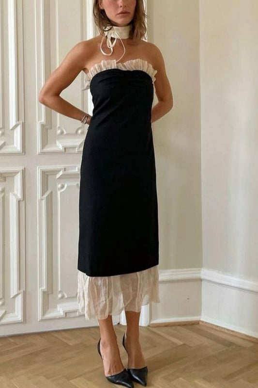 Elegantes, trägerloses Neckholderkleid im Vintage-Stil | Schwarzes und aprikosenfarbenes Tüll-Midikleid mit Rüschen – perfekt für Dates und glamouröse Partys (gh6442)