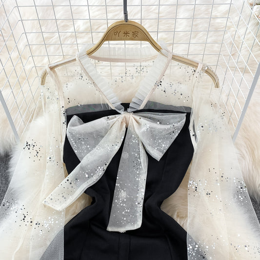Kleiner schwarzer Rock mit V-Ausschnitt aus französischem Hepburn-Pailletten-Mesh 11132