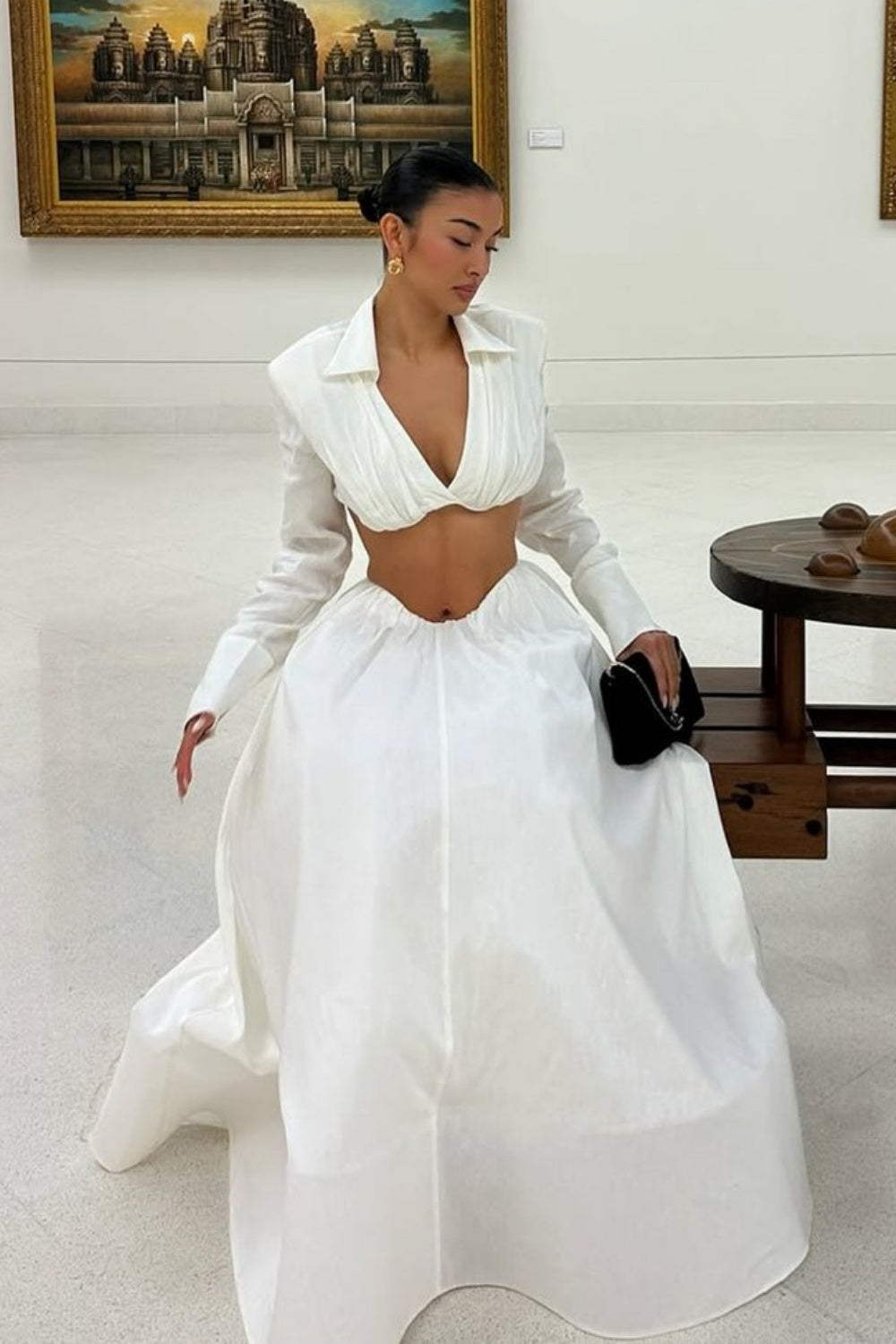 Elegantes, luxuriöses Set-Kleid mit Cut-outs im extravaganten Stil | Weißes Bandeau-Top im Hemdblusen-Stil + bodenlanger Ballkleidrock für Kunstausstellungen, Galas und gesellschaftliche Anlässe gh6437