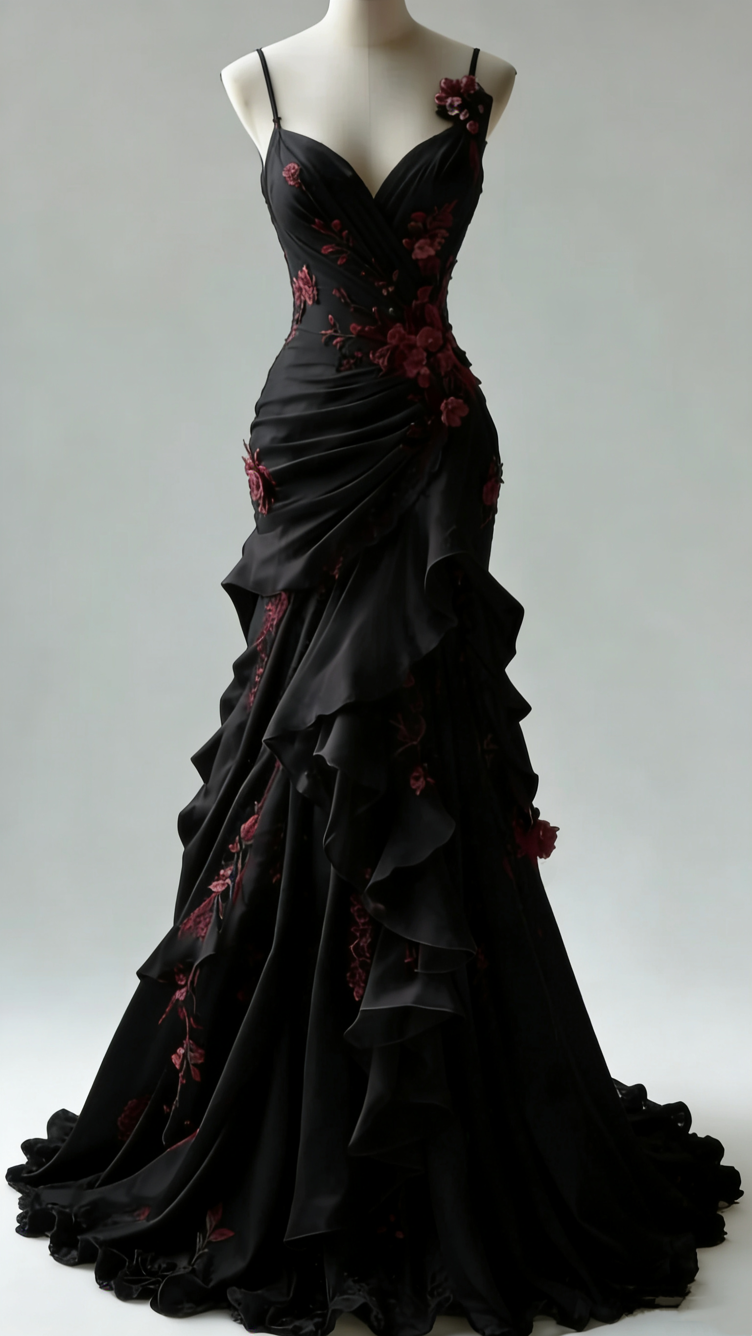 Dunkelromantisches Meerjungfrauenkleid mit Spaghettiträgern und schwarzen und roten Rosen – ideal für Dinnerpartys und Gothic-Mottopartys (gh6558)