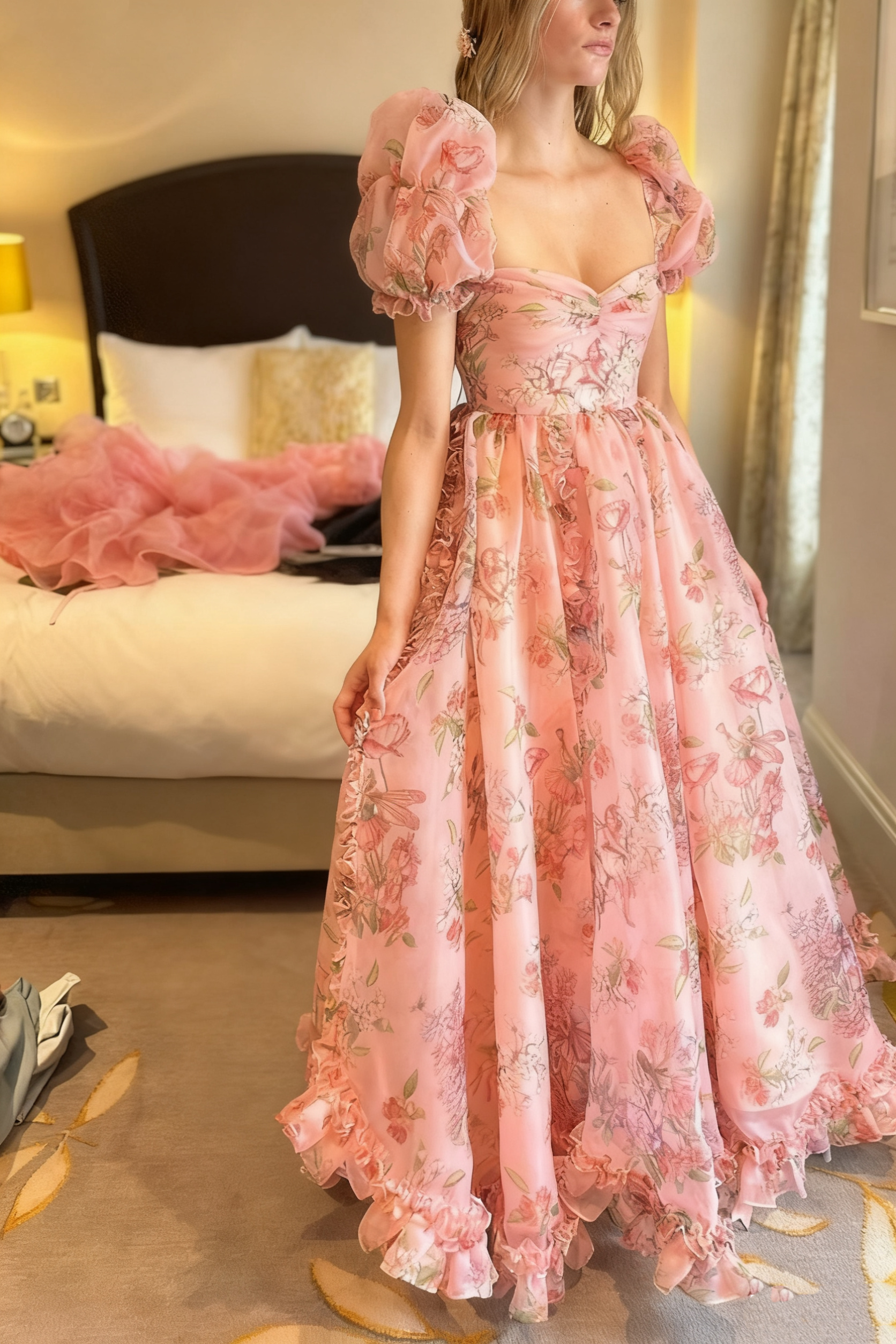 girlhomeshops-Rosa Blumenmuster Kurzarm Langes Chiffon Ballkleid Date Kleid gh5940