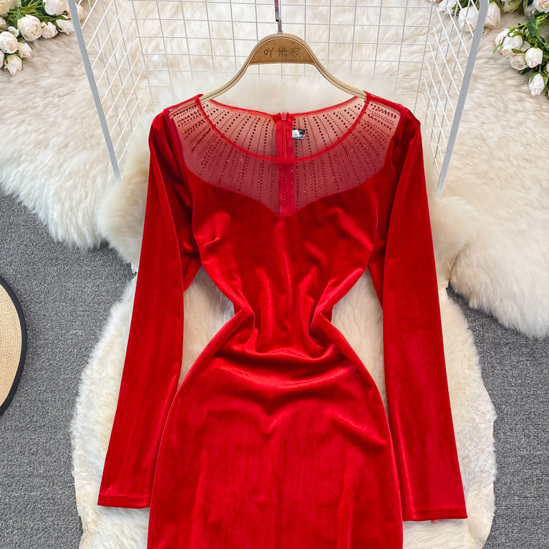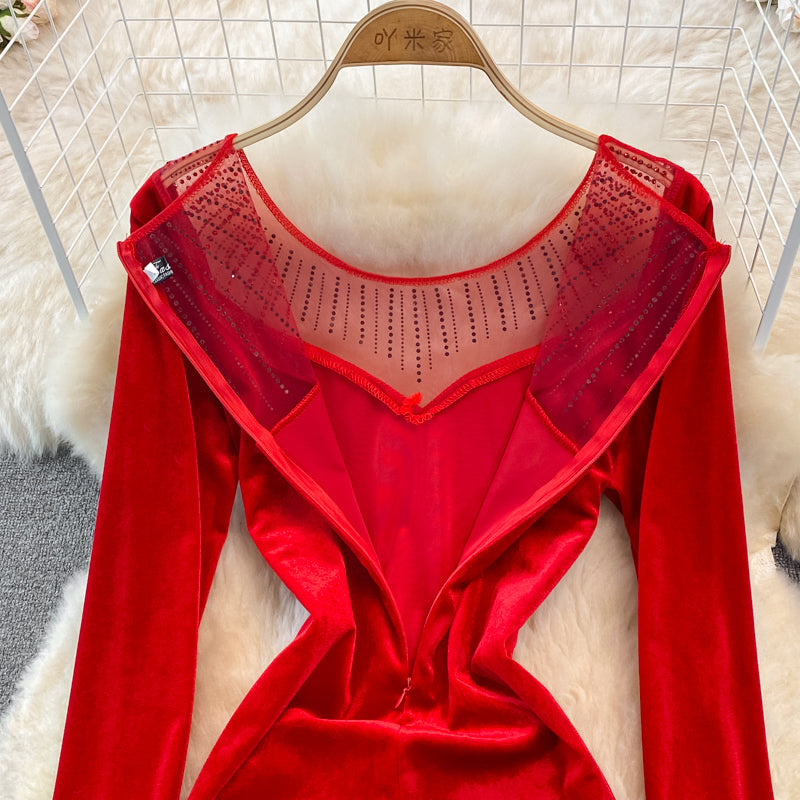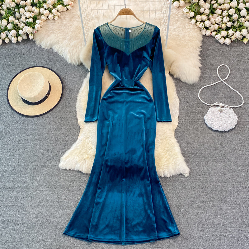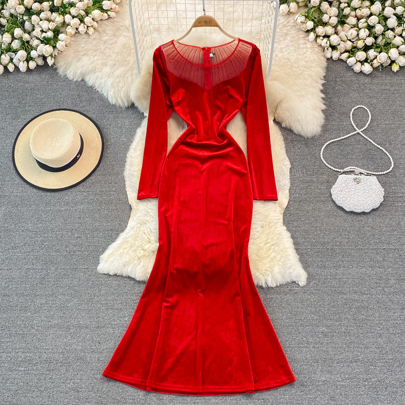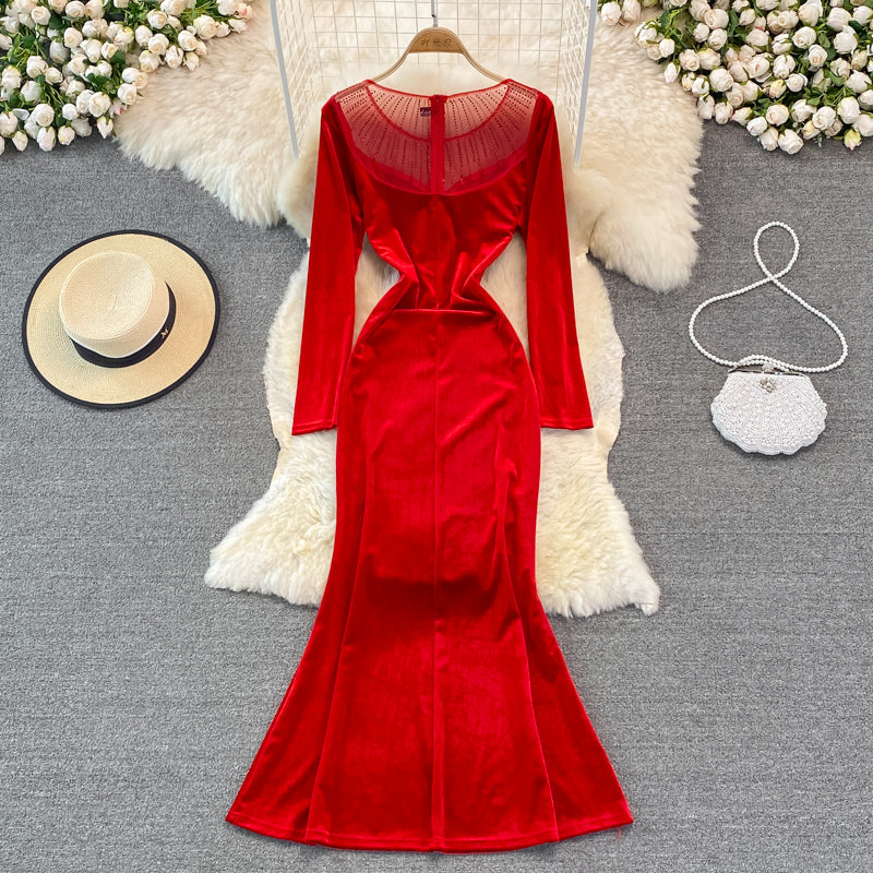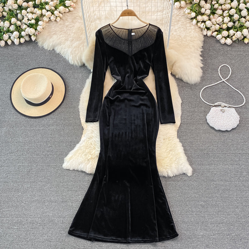 Langärmliges schmales Gesäßkleid aus Samt mit Fischschwanz 3753