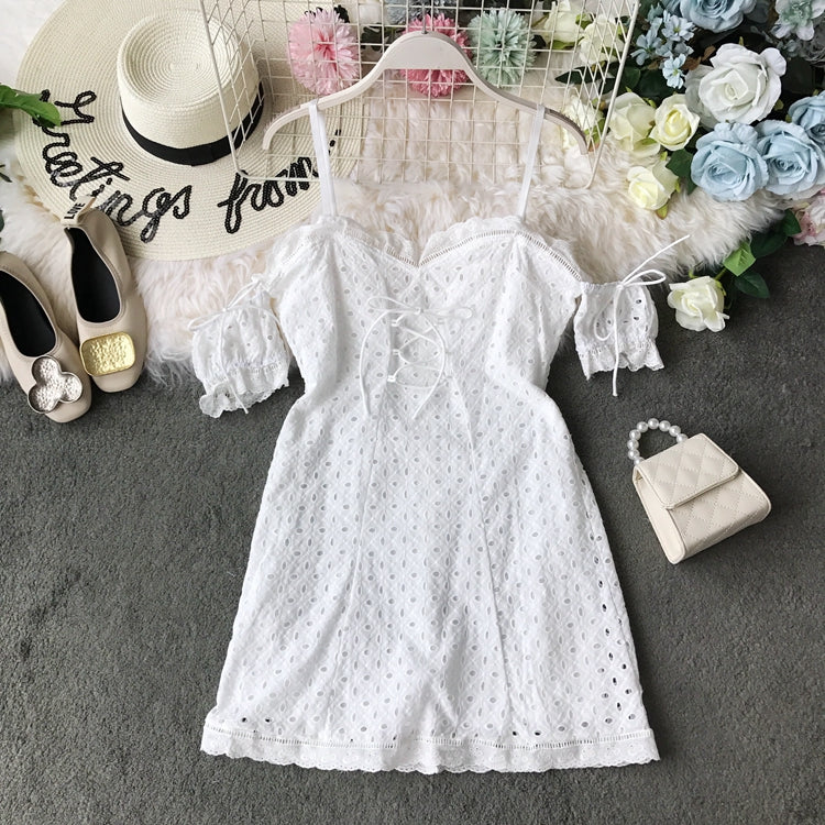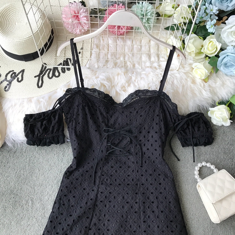 Schulterfreies, schmales, schulterfreies Kleid mit Spitzenausschnitt und Spitzenriemen 3725