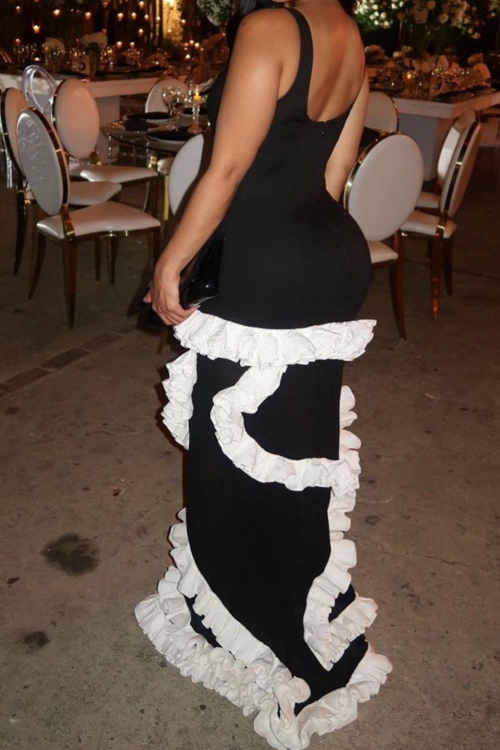 Vintage-Luxus-Abendkleid mit Spaghettiträgern im trendigen Stil | Schwarzes und weißes Meerjungfrauen-Maxikleid mit Wellenrüschen für Gala-Kunstausstellungen und exklusive gesellschaftliche Anlässe gh6441