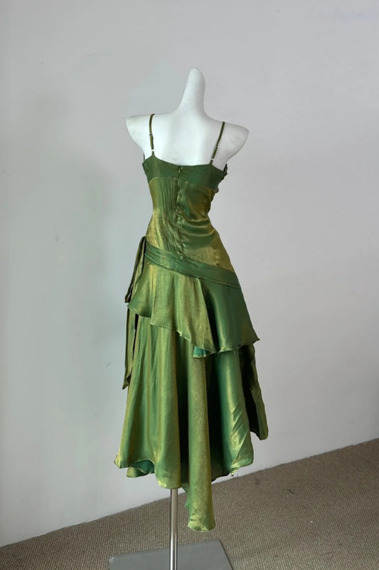 girlhomeshops-Modisches und einzigartiges smaragdgrünes glänzendes Spaghettiträger-Midikleid mit Rüschen gh5843
