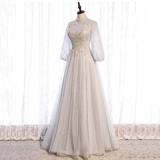 Langes Ballkleid aus grauem Spitzentüll, langärmliges Abendkleid 8081
