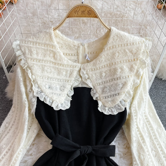 Vintage Lace genähter Puppenhals mit schmaler Taille Cordkleid 3384