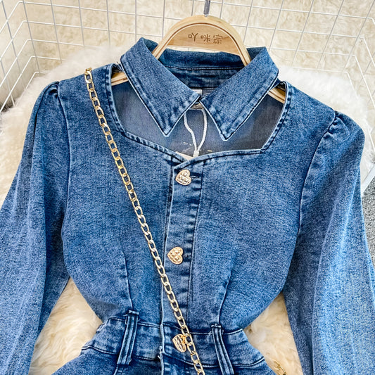 Vintage-Revers-Blasenärmel-Design, hohles Jeanskleid 3019