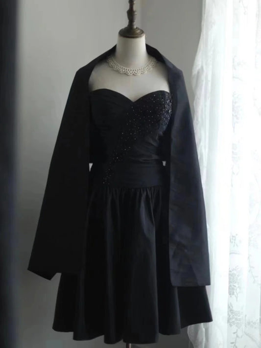 Vintage Kleines Schwarzes Kleid Taft Kurzes Homecoming Kleid Satin Herzförmiger Ausschnitt Unregelmäßiges Plissee-Design Handbestickt gh4375