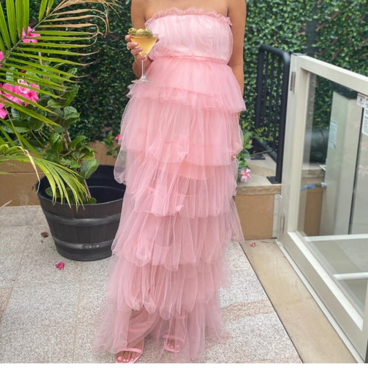 Rosa mode süße A-linie trägerlosen lange elegante layered tüll ballkleid abendkleid party kleid gh2818