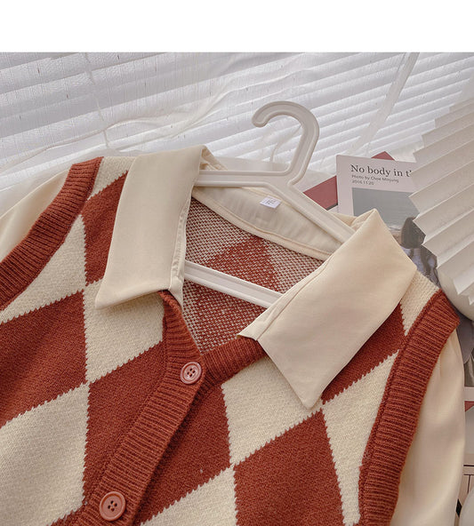 Koreanischer Retro-Hongkong-Stil, gestrickte Plaid-Nähte mit langen Ärmeln 6339