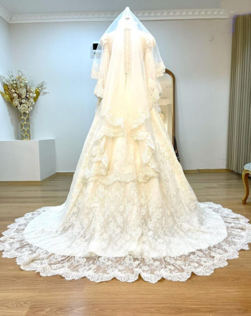 Vintage-Kleid mit Puffärmeln, Schleppe aus Spitze und Tüll | Edwardianisches Ballkleid im Maxi-Stil mit hohem Kragen für Hochzeit, Braut, Gala und Ball gh6409