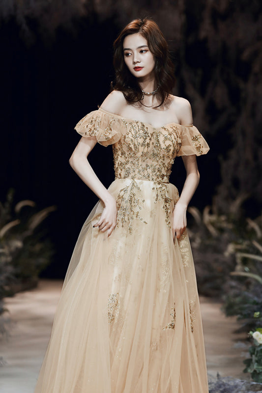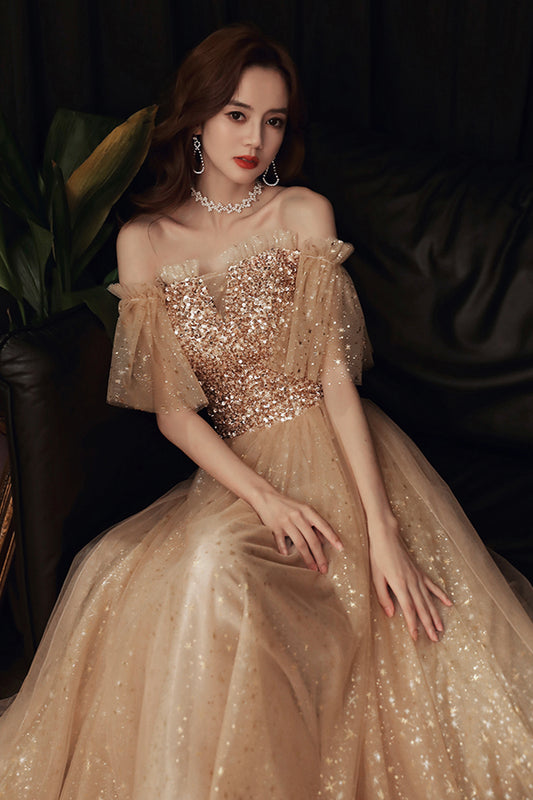 Gold tulle sequins long prom dress A line evening dress 8880