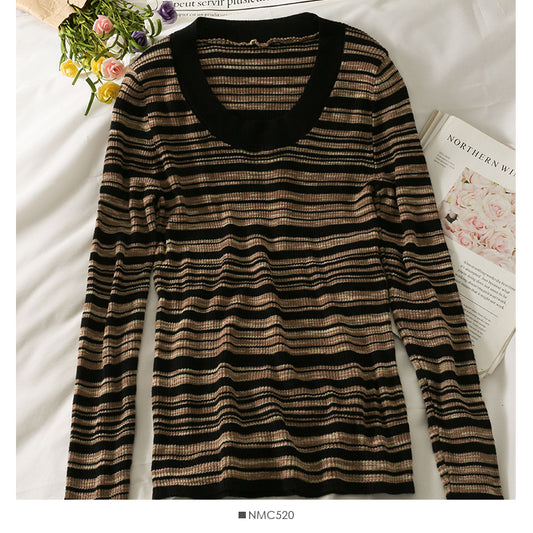Han Fan retro stripe medium long tight long sleeve T-shirt 2068