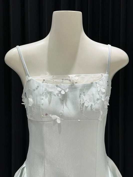 Ice blue floral satin short back to school dress, birthday party dress gh4648