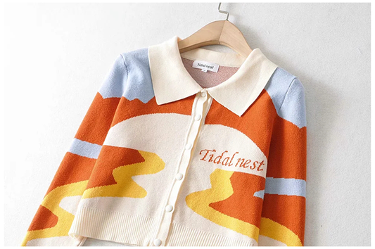 Minority design sunset oil painting super beautiful retro knitted cardigan 7211