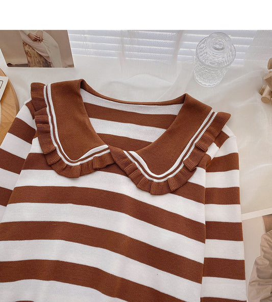 Lace doll neck contrast stripe long sleeve versatile top 6616