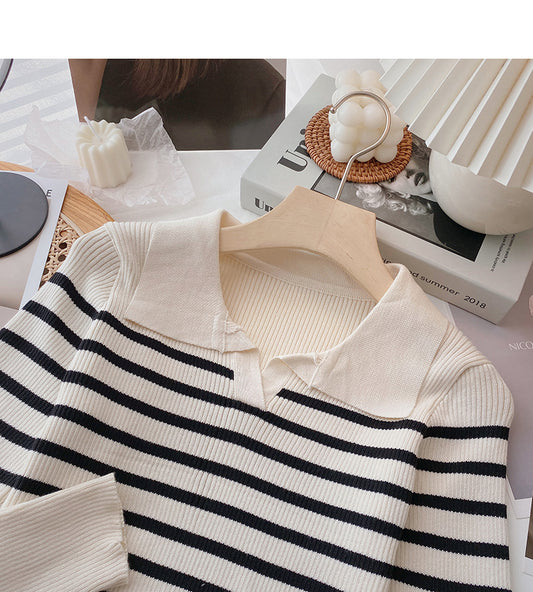 Design sense hollowed out long sleeve sweater slim striped top 6602