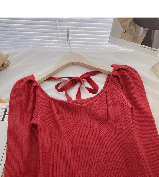Large round neck leaky clavicle sweater bandage long sleeve top 6611