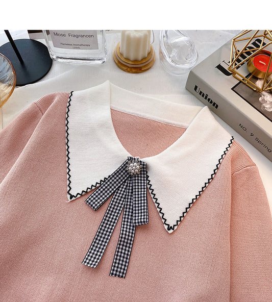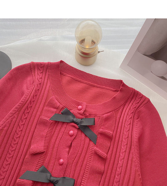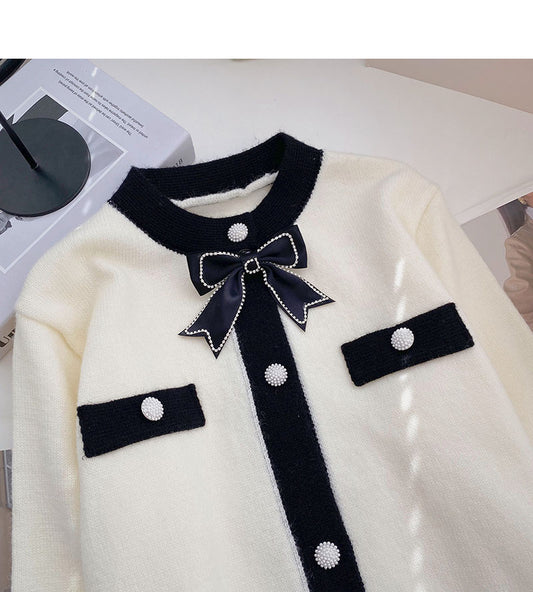 Bow small fragrance retro color matching long sleeved knitted cardigan 6495