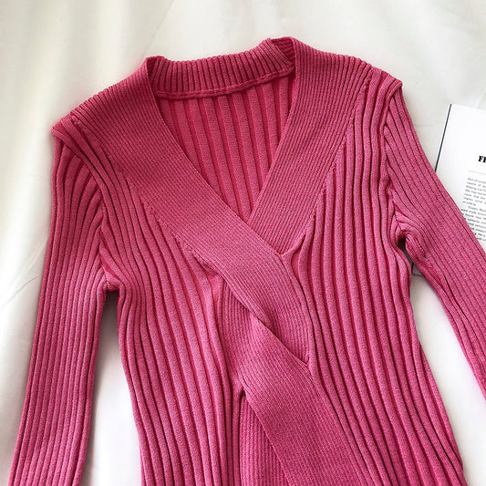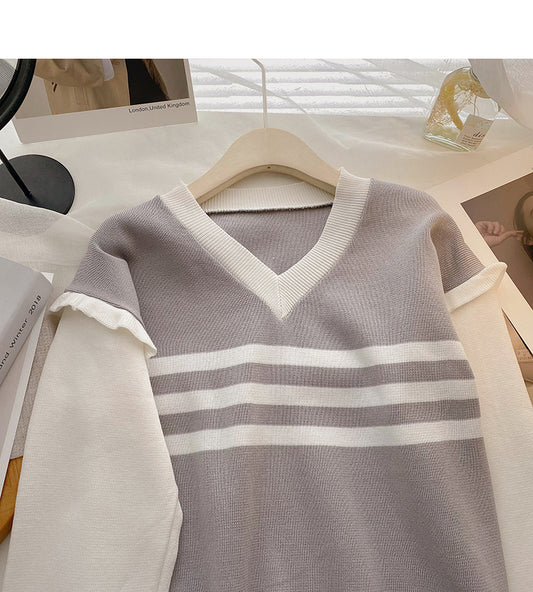 V-neck slim long sleeve slim fit net red pit strip sweater women 6501