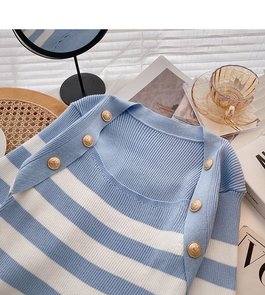 Striped square neck T-shirt thin long sleeve top 6489
