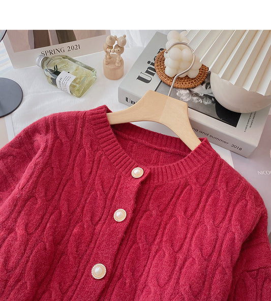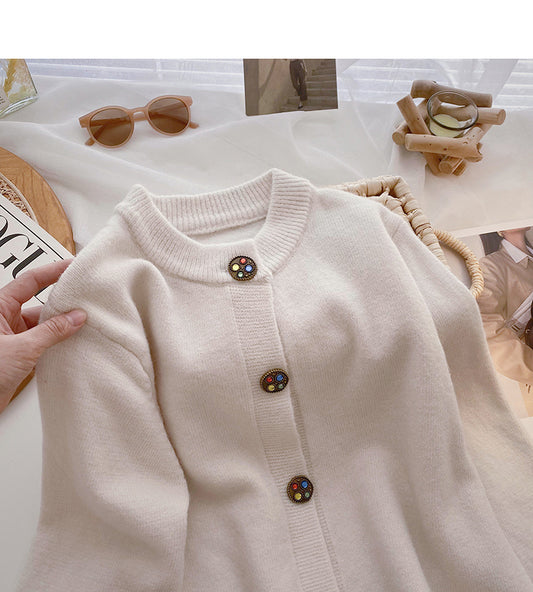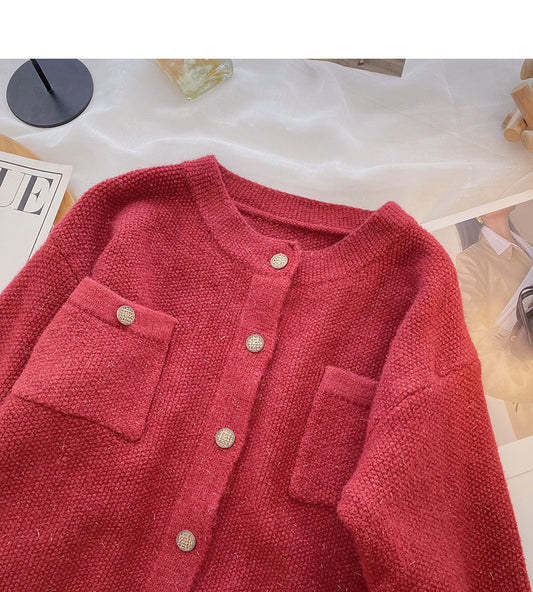 Solid gold round neck sweater small fragrance single breasted top 6166