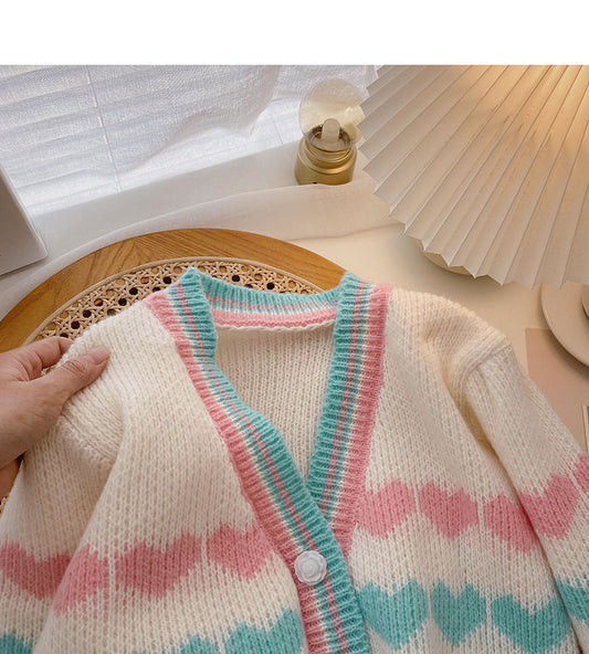Little fresh girl color contrast love short long sleeve Knitted Top 5855