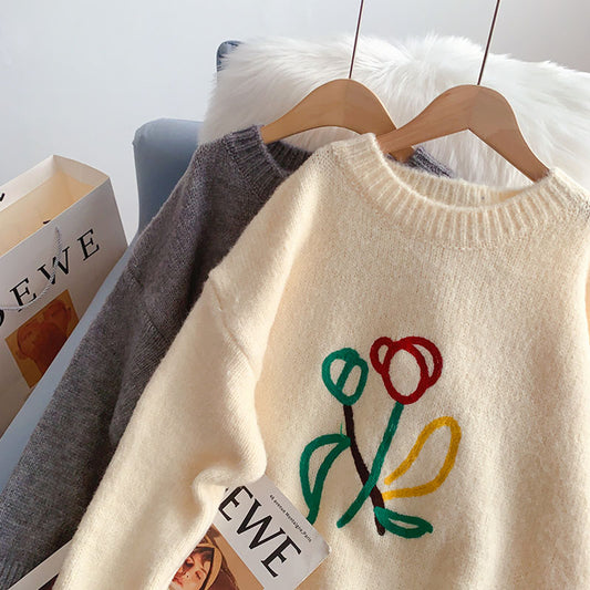 Vintage flocking embroidery sweater Crew Neck Sweater Top 5194