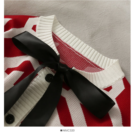 Sweet and versatile bow knot round neck single breasted sweater women 1988