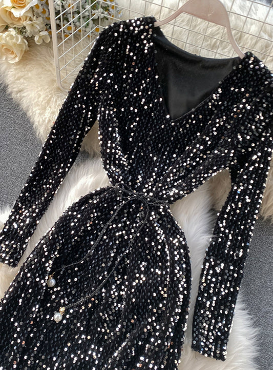 Shiny sequined long-sleeved bag hip short dress women's dress 1173