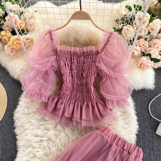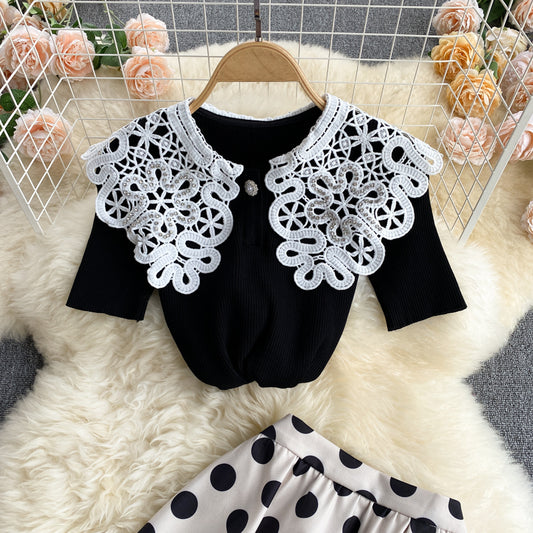 Cute knitted short-sleeved blouse for age reduction all-match polka-dot skirt fashion two-piece suit 598