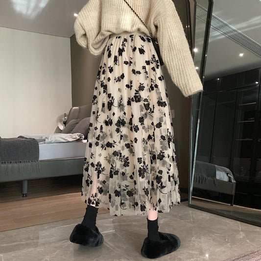 New skirt, flocking flower embroidered mesh gauze skirt 3697