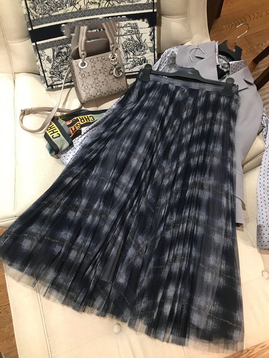 New plaid print net gauze skirt, thousand bird shape skirt 3704