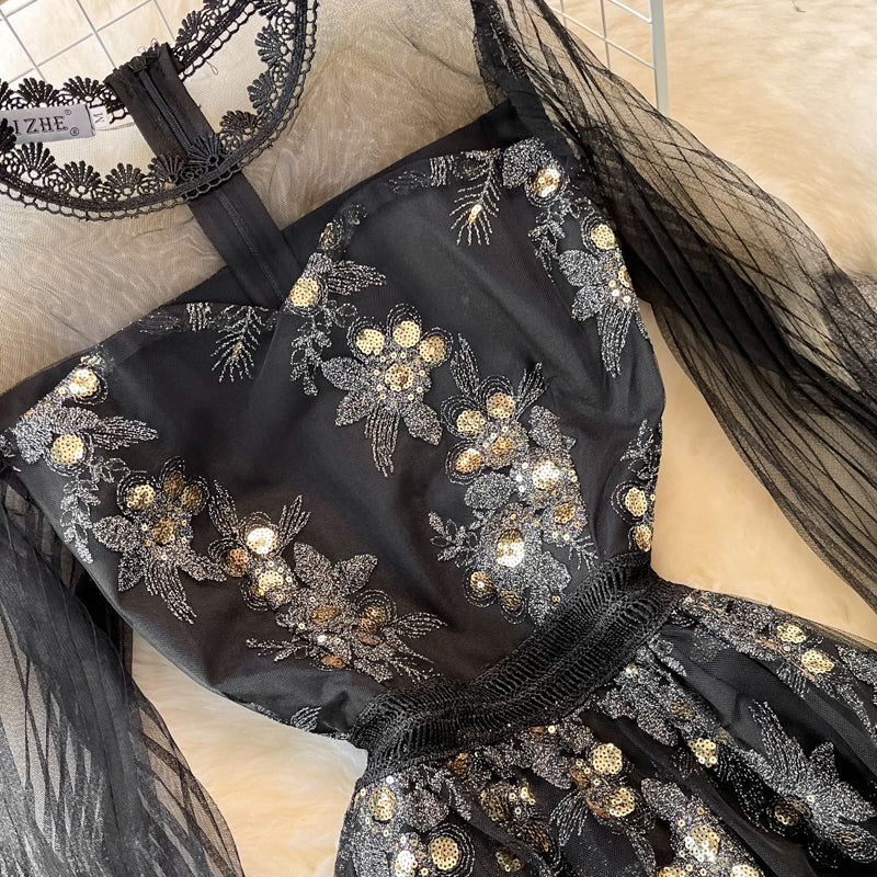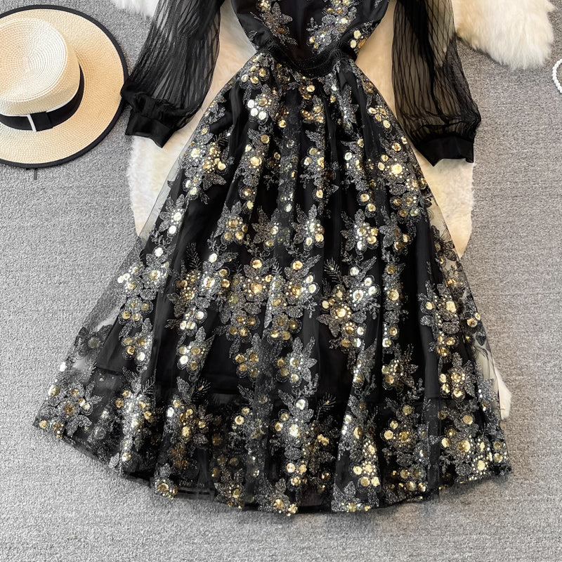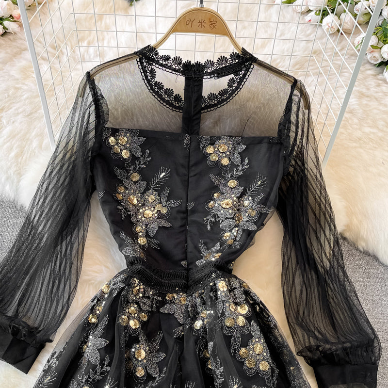Heavy industry embroidery round neck mesh A-line dress 3747