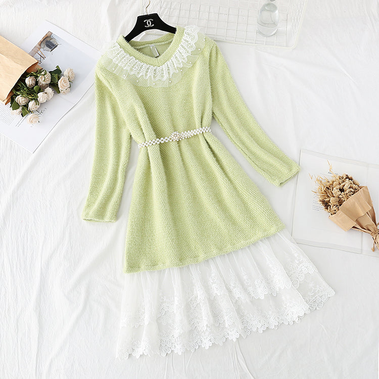 Mink plush fur sweet Ruffle lace stitched bottomed skirt 3953