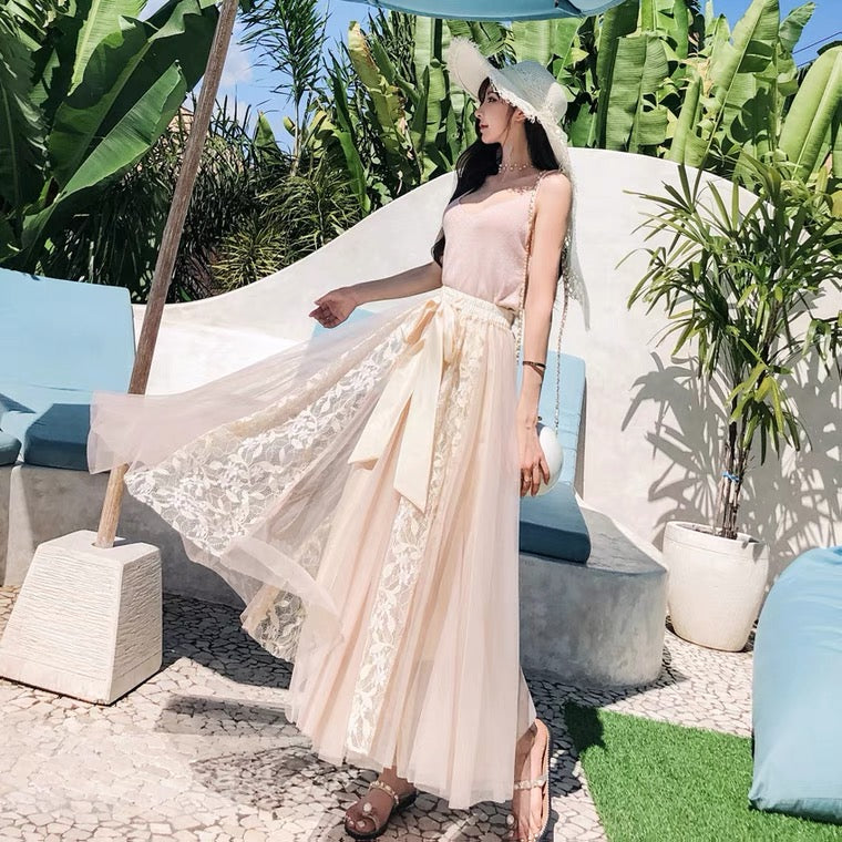 Spring and summer, new style, bow tie, high waist lace embroidery stitching big swing tulle skirt 3605
