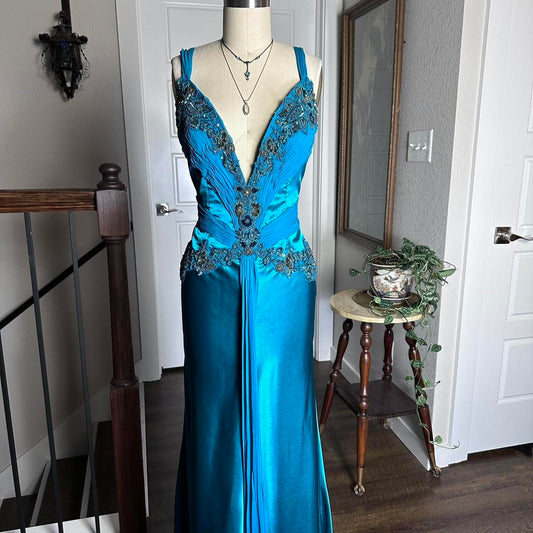 Blue Retro Fashion V-Neck Elegant Exquisite Beaded Floral Long Sexy Slim Spaghetti Strap Ball Gown Evening Gown Party Dress Prom Gown gh3680