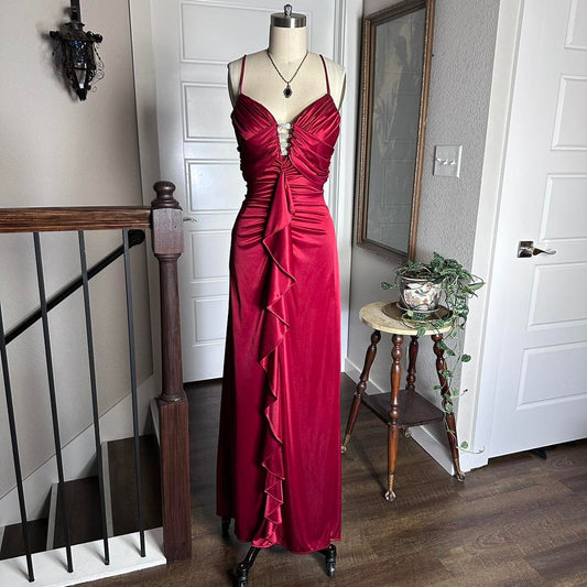 Red Retro Fashion Elegant Exquisite Rhinestone Long Slim Fit Ruffled Spaghetti Straps Ball Gown Evening Gown Party Dress Prom Gown gh3679