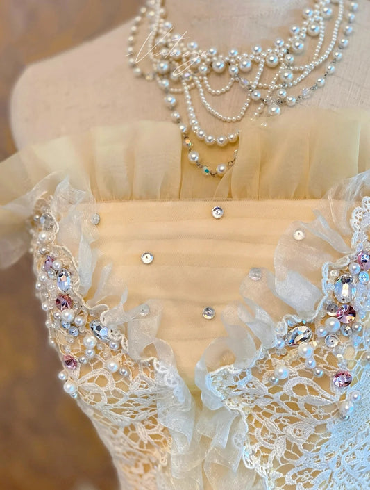 girlhomeshops-Wedding Dress Cream Satin Puff-Sleeve Lace-Embellished Floor-Length Victorian-Style Gown gh6369