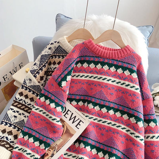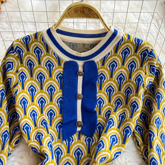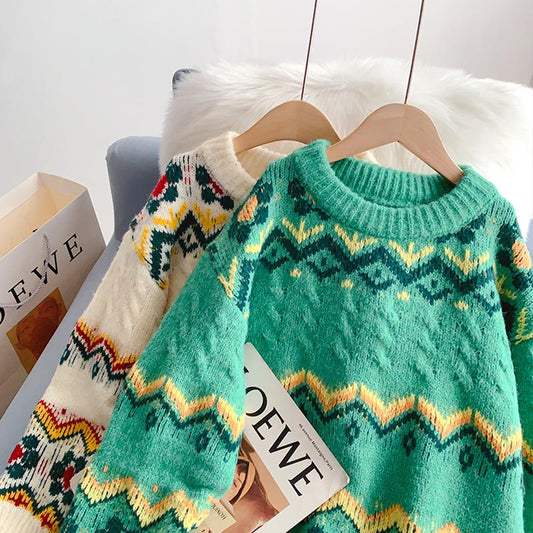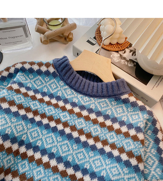 Vintage jacquard contrast Pullover long sleeve sweater 6107