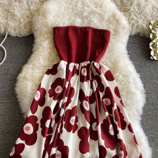 Vintage printed boydon dress, women's fashion slim slit skirt 3541