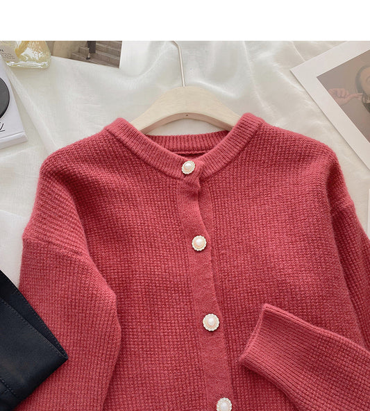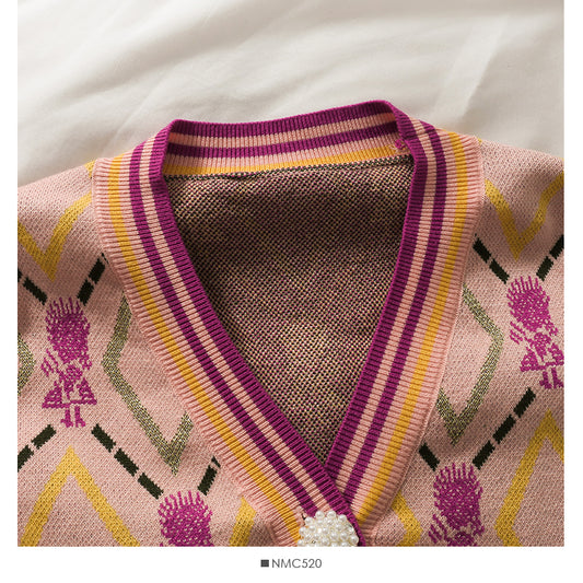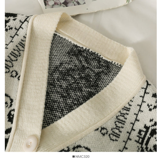 Vintage printed single breasted cardigan loose sweater women's new V-Neck long sleeve versatile sweater fashion 2031